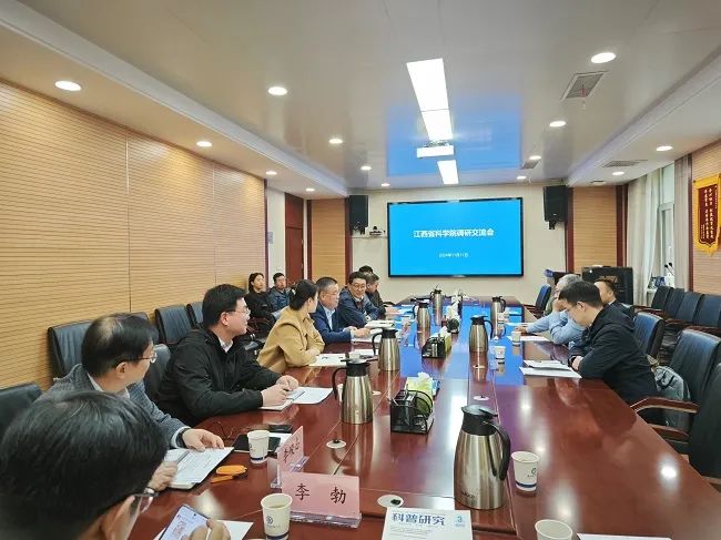 章国勇介绍了江西省科学院的基本情况、发展历程和下属研究所的学科方向和科技成果。与会人员就人才培养、科技合作、成果转化、科技管理、智库建设等进行热烈交流讨论,希望能够在微生物技术、科技战略研究等方面加强合作交流,在科技成果转移转化、产学研用平台建设等方面互相学习。