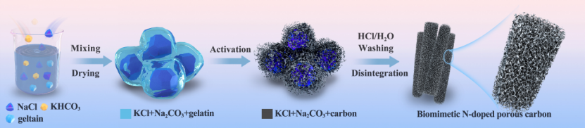 丝瓜络为常见生物质材料,具有三维多孔结构,通过赋予其丝状主体大量微孔,即可构建分级多孔结构。具备这种形貌特征的多孔碳材料也适合用于碳捕集研究,其中的大孔/介孔可作为气体快速扩散通道,而微孔可作为吸附位点。本论文研究工作提出了使用明胶作为碳源、并加入nacl与khco3对碳材料结构进行导向性合成,成功制备了具有类似丝瓜络的氮掺杂分级多孔材料。研究团队通过进行大量对比与平行实验,发现这种特殊三维结构的形成机理可用溶解-再结晶-自组装-崩塌等关键过程描述,所加入的无机盐起到了硬模板与活化剂的作用。所制备碳材料的比表面积为1130-1874 m2/g,氮元素含量为5.7-7.9 wt%,其常温常压下的co2吸附量达到3.50 mmol/g。研究团队还总结分析了37种使用不同方法制备碳材料的相关测试结果,发现碳材料在低压下的co2吸附量与co2/n2吸附选择性直接关联,而这也正是在吸附初始阶段最先被饱和的高活性吸附位。以上研究结果将对多孔碳材料的合成与碳捕集研究起到重要的启示作用。